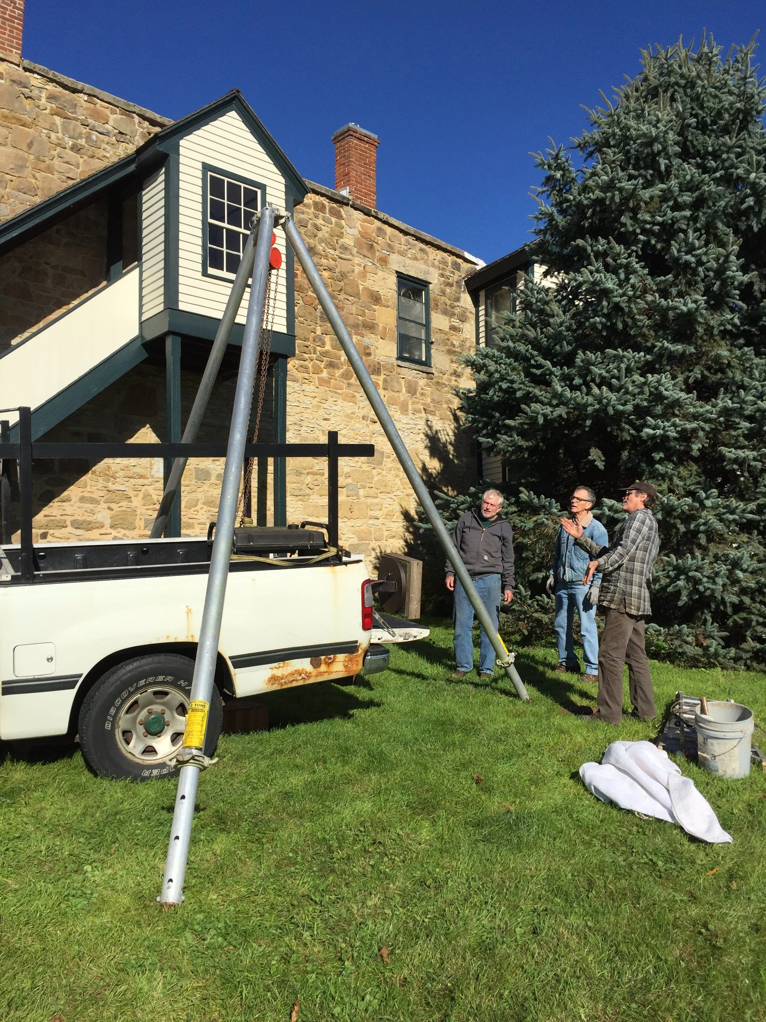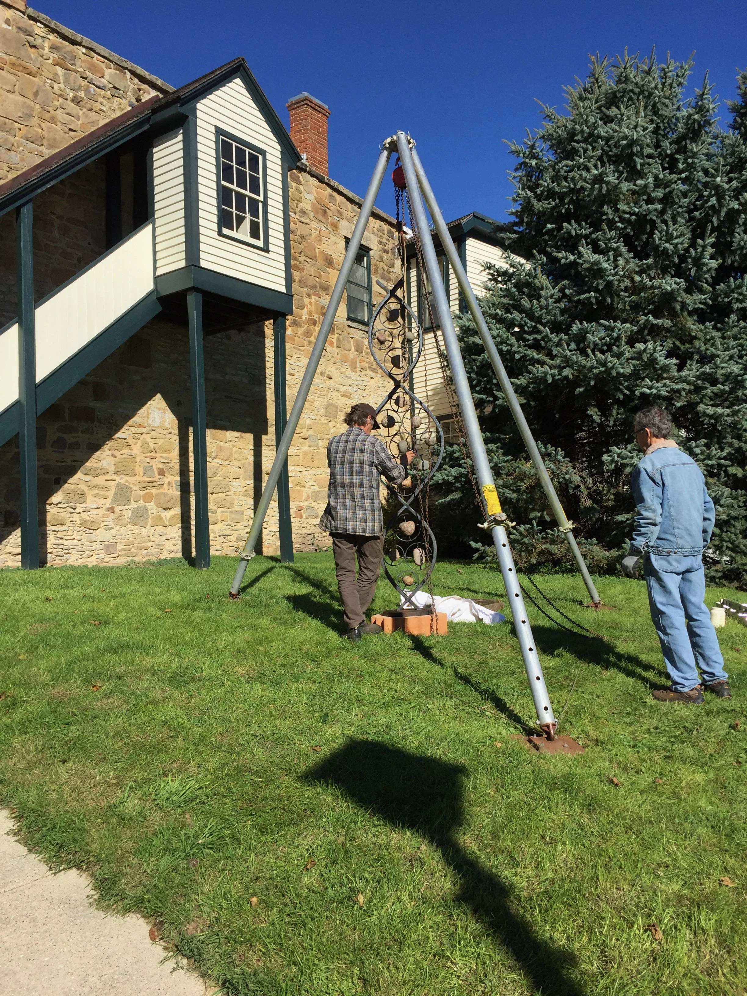 We currently have three sculptures displayed in prominent locations, all within the confines of the downtown historic district. The first is located at 310 High Street, next door to the historic Masonic Lodge and across the street from the Mineral Point post office. “Inland Sea Fowl” is a kinetic sculpture by local artist Evan Lewis. The land is owned by the city of Mineral Point.