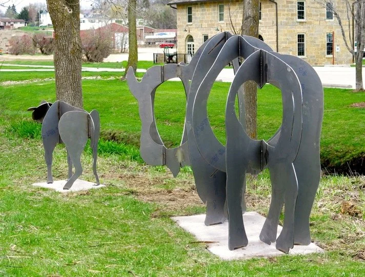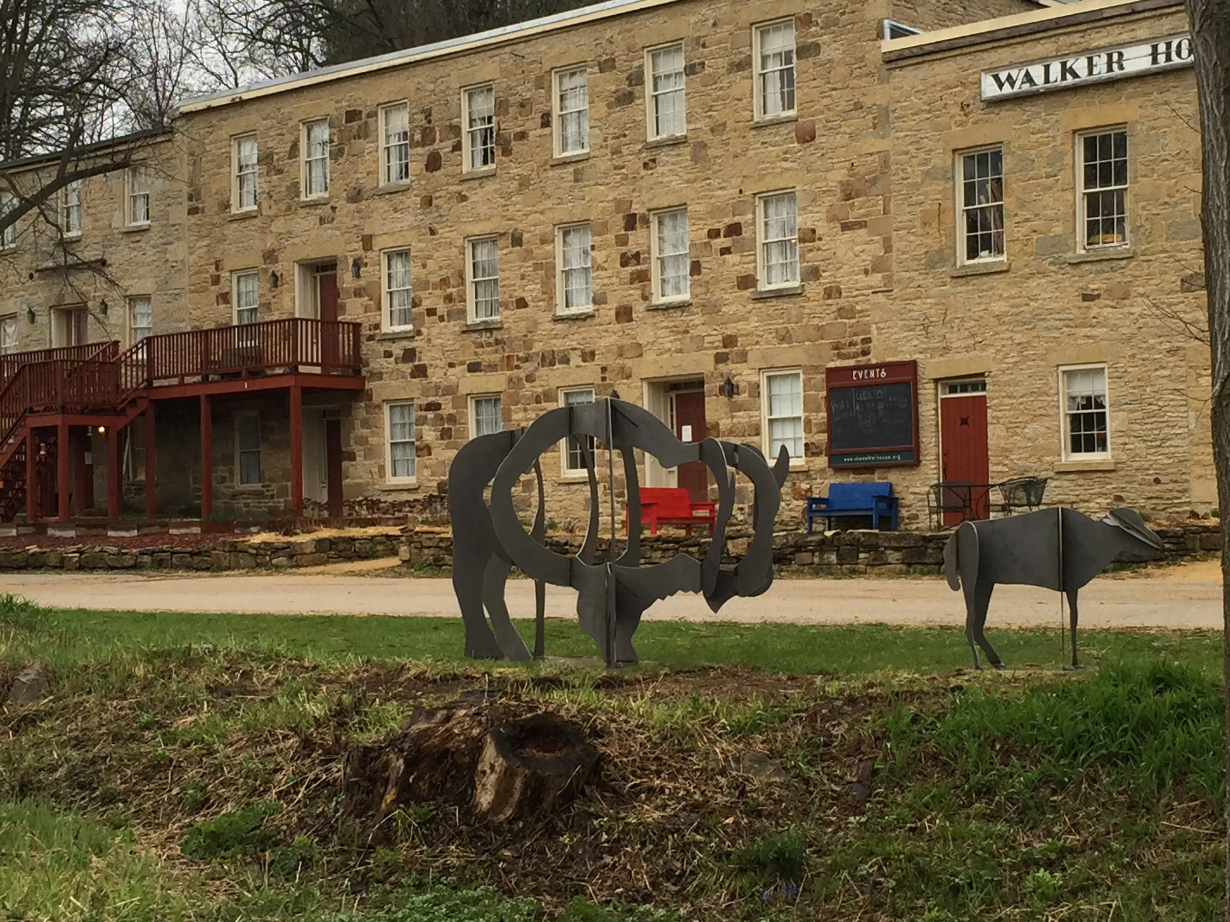 The second sculpture is on Brewery Creek, across from the Walker House, on land owned by the Walker House. “Will Rust for Peace” is a sculpture of a bison and her calf, by Mineral Point artist Bill Grover.
